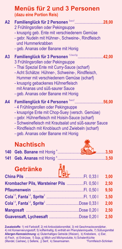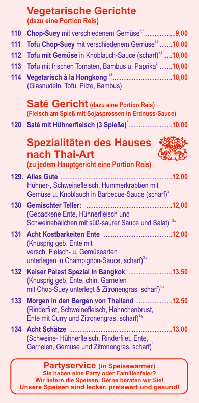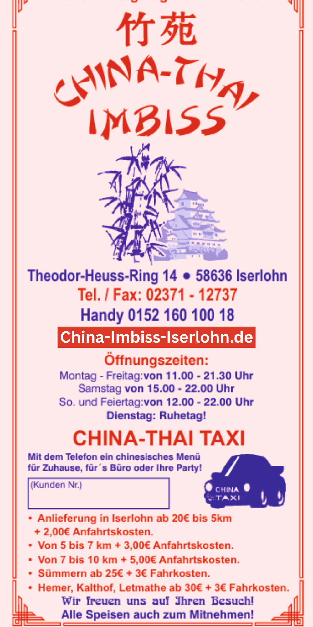 Seit über 20 Jahren ist der China Thai Imbiss in Iserlohn für Euch da und liefert Chinesische Spezialitäten. China Thai Imbiss Empfehlung 9a - FrühlingsrollenThai- Spezial-Frühlingsrollen mit Hühnerfleisch 134 - Acht SchätzeSchweine,-Hühnerfleisch, Rinderfilet, Ente, Garnelen, Gemüse und Zitronengras, scharf 44 - Knusprig geb. HuhnReis mit verschiedenem Gemüse und BBQ Sauce Anrufen & Bestellen 02371/12737 Aktuelle Speisekarte Bester chinesischer Imbiss in Iserlohn. Super Geschmack, Mega Portionen. Karsten Schulte Iserlohner Abholservice Sie bestellen ihr Gericht aus der Speisekarte und vereinbaren die gewünschte Abholzeit. Lieferdienst Einfach das gewünschte Gericht in der Speisekarte aussuchen, anrufen und bestellen um liefern zu lassen. Partyservice Ob Party, Feste oder Betriebsfeiern - der Iserlohner China Thai Imbiss liefert Ihnen die gewünschte Mahlzeit.